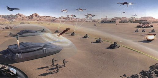 “人们往往高估最近 1~2年的发展,但常常低估未来 5~10年的变化。”1903年,《纽约时报》写到,真正能飞的机器将会在 100~1000年内因数学家和机械学家共同的不懈努力而成为现实。然而,在 1911年意土战争中飞机就展示了军事威力,到第二次世界大战时期飞机已经成为不可或缺的重要武器。对于机器人领域,情况或许相同。1950年,科幻小说《我,机器人》(2004年拍摄为电影《机械公敌》)以丰富的想象力描述了 2035年智能机器人的觉醒,以及机器人军团的宏大场景。尽管机器人军团在今天看来还比较虚幻,但智能化战争并不遥远:2008年,美国国会就已经要求美国国防部“在新系统采购项目中要显示出对联合无人系统的倾向,即任何致力于发展载人系统的项目必须开具证明以说明为什么无人系统不能满足相同的需求”。截至2008年底,美军地面机器人作战系统多达 12000套,空中无人机 5331架,水下机器人 140余只。尽管现役军用机器人皆处于人为操作的受控状态,但美军已经把机器人自主系统作为 2040年前军用机器人的发展路线图的关键能力,俄军也确定了当前装备技术研发的急迫需求是提高军用机器人技术系统的自主性和控制智能化水平。2015年底,俄军正式编制“机器作战连”,并在攻夺叙利亚拉塔基亚省 745.5 高地的战斗中发挥了关键作用,俄军用 6台“平台-M”履带式战斗机器人、4台“暗语”轮式战斗机器人、1套“洋槐”自行火炮群、多架无人机相互协同,在“仙女座-D”指挥系统的操控下,完成了世界首次无人机器部队实战行动。未来军事斗争的无人化、智能化的发展趋势显而易见。图 1显示的就是英国 BAE公司设想的未来战争示意图,由此预见,无人军团的智能指挥将发挥重要作用。