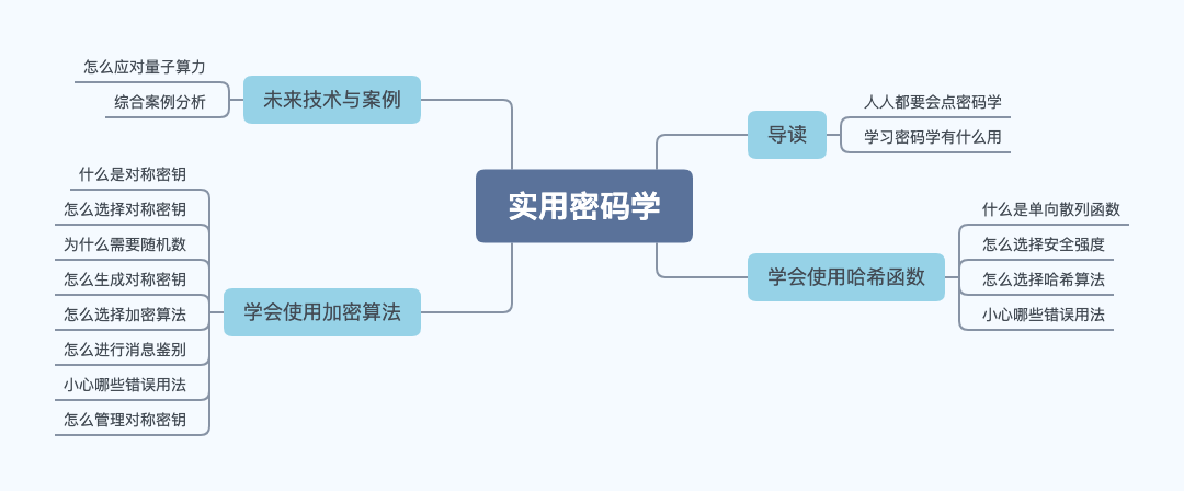 教你用好密码学,就是这个专栏的目标。我想通过这个专栏帮助你把握住基本概念、弄明白适用场景、躲得开常见错误。所以,我将从「密码学知识体系、加密算法的使用、真实案例分析」这三部分来分享我的经验。