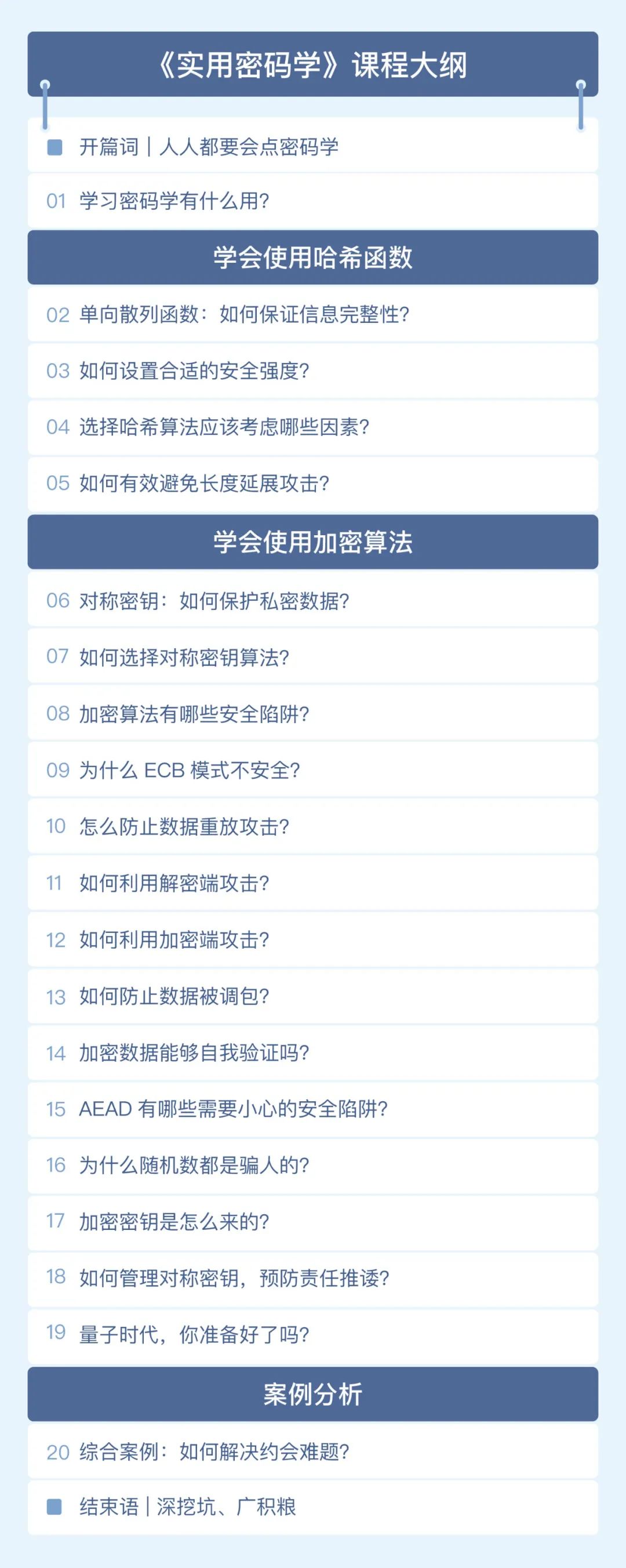 所以,这次我与极客时间合作,出品了《实用密码学》这个专栏,想帮技术人,更快速掌握密码学核心技术。这个专栏是我在密码学应用领域工作 20 余年的结晶,可以教你组合多种密码技术的应用方法,更有 10+ 企业级密码学应用场景分析,给你的技术提供更多的安全保障。