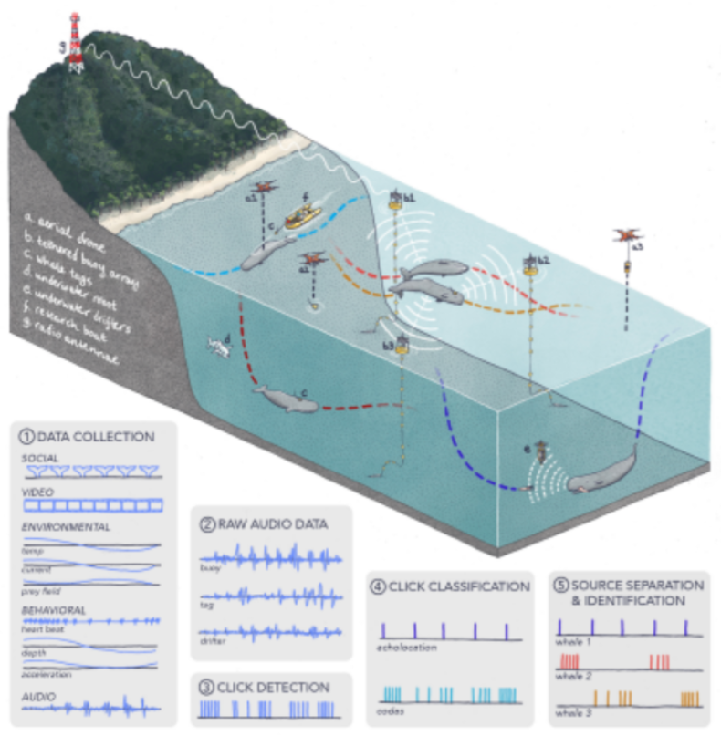 解码:借助 ML 技术,构建鲸鱼的交流模型并描述其结构,将其与行为紧密联系起来;