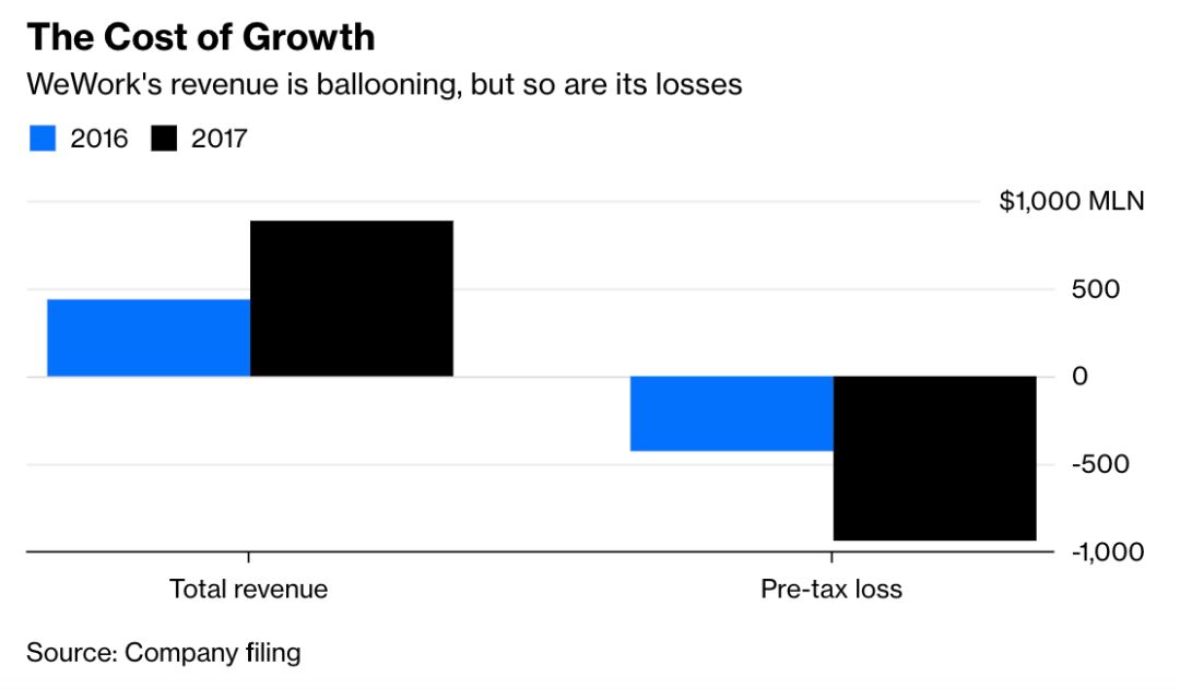 在2016年亏损4.3亿美元后,WeWork 2017年的税前亏损增至9.39亿美元。该公司2018年在债券市场进行的融资并不顺利,偏好使用的“社区调整后Ebitda(息税折旧摊销前利润)”等指标也受到了嘲讽,因为这个指标在普通商业地产行业独一无二。为什么软银会无视这些危险信号,甚至以更高的估值追加投资?