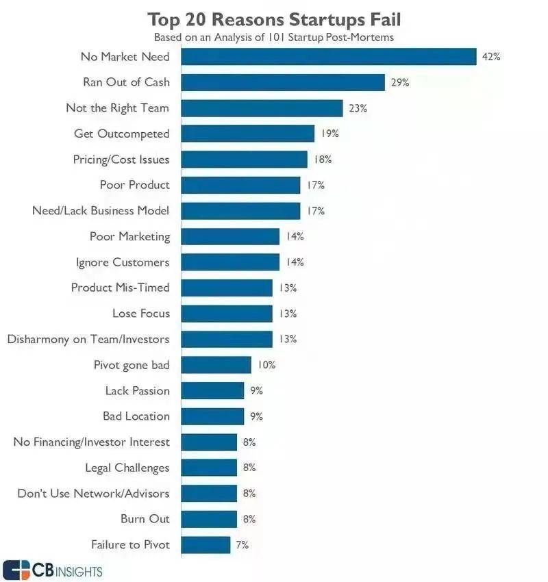 其实早在2015年,外国的投资公司CB Insights就对101家失败的创业公司进行了“验尸”,可以看到:高居前三位的分别是没有市场需求(42%)、资金链断裂(29%)、团队不合适(23%),从中可以看到市场需求和资金是导致创业失败的主要因素。