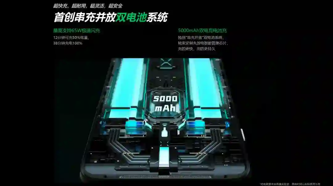 据黑鲨官方所述,叫“串充并放”,啥意思呢,采用两块对称电芯,充电的时候将这俩串联,这样功率就能做大,考虑到我们熟悉的 SuperVOOC 就是这么搞的,因此秒懂;放电的时候将俩电芯并联,这样电压和一块电芯相同,可以直接给元器件供电,这也很好懂。两边加一起,看上去就很通俗易懂了。