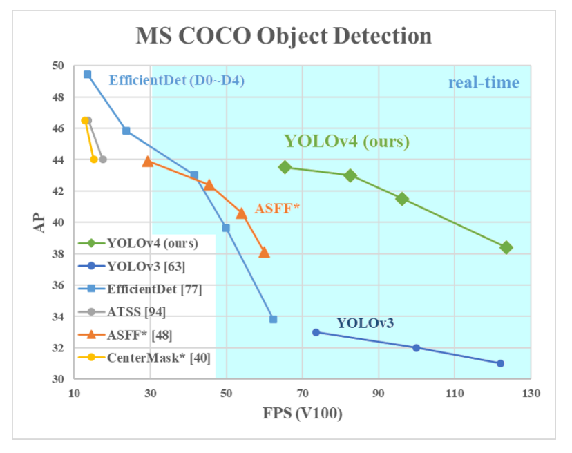 据介绍,YOLOv4 在 MS COCO 数据集上获得了 43.5% 的 AP 值 (65.7% AP50),在 Tesla V100 上实现了 ∼65 FPS 的实时速度。