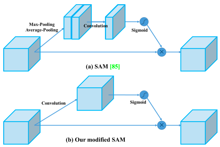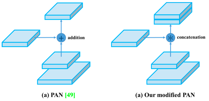 研究者还将 SAM 从空间注意力机制(spatial-wise attention)修改为点注意力机制(point-wise attention),并将 PAN 中的捷径连接替换为级联,如下图 5、6 所示:
