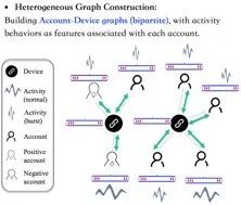 第一、我们构建异构图,包括账户类节点,以及多种类型的设备信息,如:电话、MAC、IMSI 以及其他 ID。