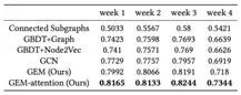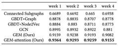 我们使用了连续 4 周的数据,比较了 GEM 和其他有竞争力的方法在这些数据上的 AUC 和 F1-score 上的表现。