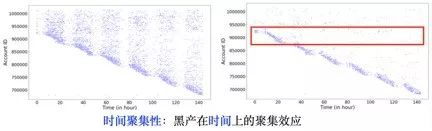 2.时间聚集性:见下图所示。两张图分别展示了账户(纵轴)在时间(横轴)上的行为序列。其中一个蓝点代表该用户在某时间点上有登录行为。左图仍然为正常账户,而右图则是黑产账户。因为我们取的都是新注册账户,所以在注册时间点前无行为。从左图可以看出,正常账户在注册之后,每天会有均匀的登录 pattern,右图中的黑产账户则只在某个时间段内集中达成某种行为,这种 pattern 我们称之为时间聚集性。