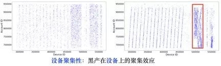 1.设备聚集性:见下图所示。两张图分别展示了用户(纵轴)过去是否在设备(横轴)有过登录行为。蓝色点代表该用户过去有在某设备上登录过。其中,左图显示的是正常账户特征,右图显示的是恶意账户特征。从图中可以看出,左图 pattern 较为均匀(regular),即便不同类型的设备(媒介)上,其和账户连接的 pattern 可能密度不太一样。右图则完全不同,我们可以在黑产账户上看到极为有规律和稠密的 pattern。这说明,黑产账户更倾向于在设备(媒介)的联通上有着高聚集性。