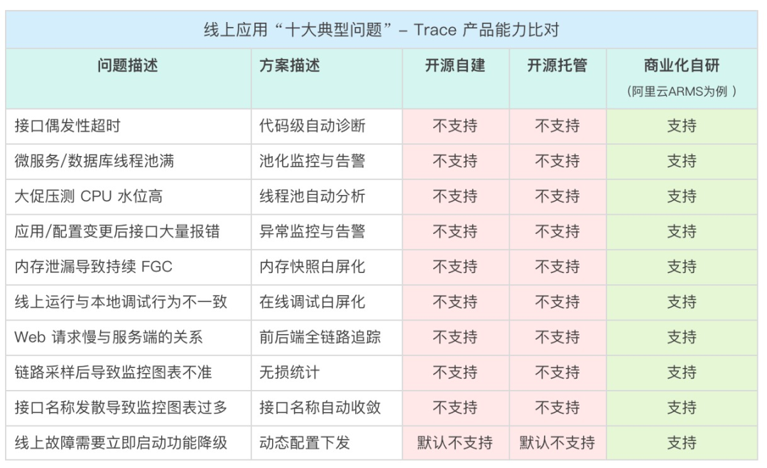无论是动态降级还是动态开启,都需要在不重启应用的前提下进行动态配置下推。而开源 Trace 通常不具备这样的能力,需要自行搭建元数据配置中心并进行相应的代码改造。而商业化 Trace 不仅支持动态配置下推,还可以细化到每个应用独立配置,比如应用 A 存在偶发性慢调用,可以开启自动慢调用诊断开关进行监听;而应用 B 耗时对 CPU 开销比较敏感,可以关闭此开关;两个应用各取所需,互不影响。 二 开源自建 vs. 开源托管 vs. 商业化自研 上面列举的生产环境“十大典型问题”都是目前开源自建或托管 Trace 产品暂未解决的。其实开源方案有很多优秀的特性,比如广泛的组件支持,多语言方案统一,灵活的数据/页面定制化等等。但是,开源不是灵丹妙药,生产环境也不是试验田。涉及线上稳定性这条生命线,我们必须谨慎评估,深入调研不同方案的优劣,不能仅停留在通用基础能力的比对,这会为后面的应用推广带来巨大的隐患。