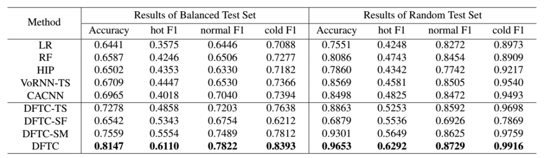 我们首先跟基于特征的分类方案(分类器分布是 LR 和 RF)以及 state-of-the-art 的时序预测方案(HIP,VoRNN,CACNN)进行了对比,对比指标是分类准确度和三类各自的 F1 性能,可以看出我们的方案取得了最优的效果。