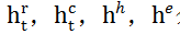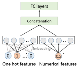 在线文章的内容特征(文章是否写的用心,公众号受众是否大等)很大程度上决定了它们能否受到大众喜爱。元数据特征包括独热编码特征,如类别,也包括数值型特征,如发布账号的粉丝数量。因此我们利用embedding技术将这些特征嵌入到同源dense vector中,并将FC layer应用于特征组合,得到总体的元数据表示向量he。