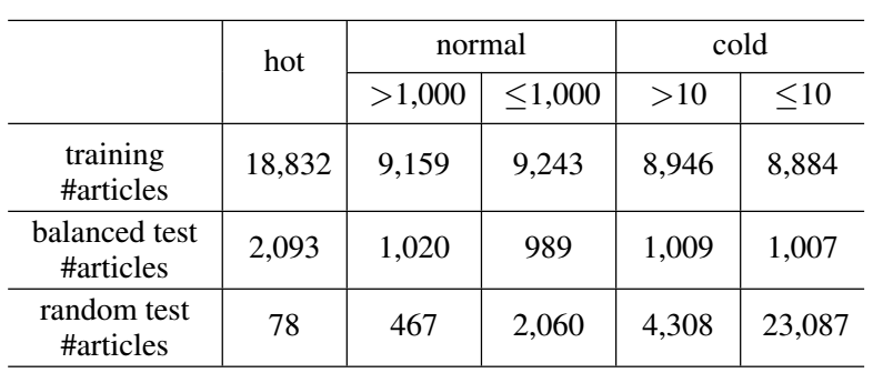 我们收集了 2018 年 5 月-7 月的 6 万篇微信公众号文章的热度数据,将文章热度分为 3 类,爆款(阅读量>10000),冷门(阅读量<100)和普通 (其它)。由于文章阅读量分布是一个极端幂律分布,我们采用分段降采样的方式,得到一个类别基本平衡的数据集作训练 (training set) 和测试 (balanced test set),此外还根据按照真实分布采样了 2 万篇文章作为另一个测试集 (random test set). 数据集统计情况如下: