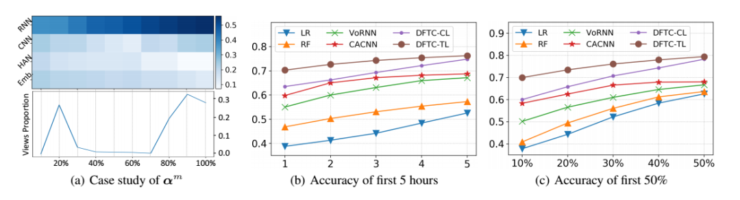 最后,在文章热度预测问题上,我们更关注于在文章发布初期的预测性能。图 3(b) 和图 3(c) 分别是文章发布后前 5 个小时的平均准确度和观察到的热度达到最终热度 10%-50% 时的平均准确度,可以看出我们的方法在文章发布早期获得了显著提升。特别是加了时间衰减因子后的模型 (DFTC-DL)。