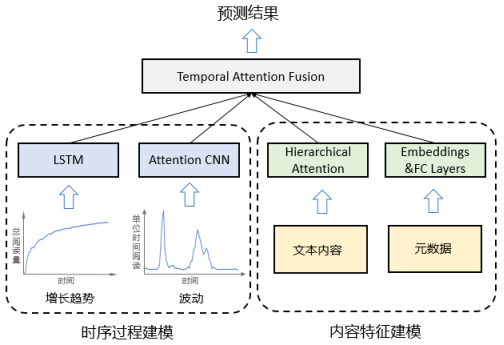 文章的用户行为会受外界因素影响而产生难以预测的短期性波动,文章的文本和元数据特征通常包含多种模态,也增加了建模的难度。我们将整体模型设计为用户行为时序过程建模和文本特征建模两部分。在时序过程建模中,我们采用LSTM和CNN分别建模流行度演变过程中的长期变化趋势和局部短期波动。在内容特征建模中,利用层次Attention网络和embedding多模态的元数据特征。最后,采用时序注意力融合单元来动态地整合以上子网络。