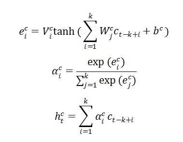 另一方面,由外部因素引起的波动使得单位时间阅读量曲线呈现出上升和下降阶段,看起来像“山脉”和“山谷”,如图2所示。这些“山脉”和“山谷”是平移不变的局部结构。因此,我们提出用CNN捕获这样的短期波动结构。此外,影响因素的随机性导致在不同的时间范围内持续,这意味着“山脉”具有不同的宽度,于是采用不同大小的多个卷积核来捕获不同的波动范围。由于CNN通常需要固定大小的输入,假设输入窗口宽度为k, 则每个卷积层的输入为t时刻前长度为k的剪切序列{vt-k + 1,vt-k + 2,...,vt},应用相同的填充操作并获得长度为k的输出序列{ct-k + 1,ct-k + 2,...,ct},捕获最近历史的波动模式。最后,我们采用注意力机制通过时间维度合并输出序列{ct-k + 1,ct-k + 2,... ,ct}到输出向量中。注意力机制为卷积层输出序列中不同时刻的向量c乘以不同的注意力权重αc,从而有助于输出更多地关注受到外部因素影响的时间点。权重αc和输出向量的计算方法如下: