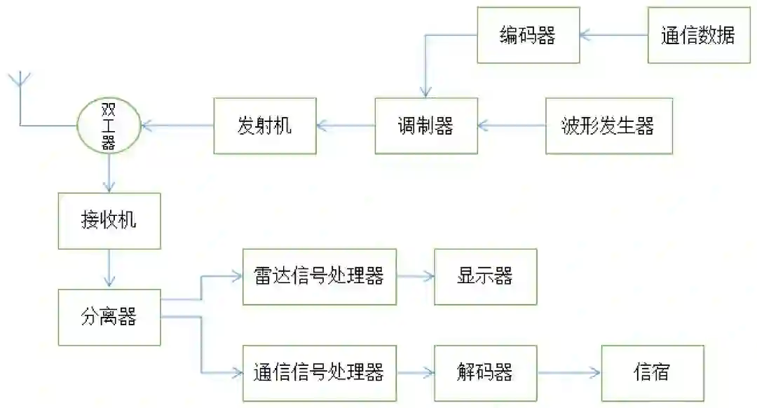 雷达系统和通信系统的一体化首先是以共用相同的硬件平台为基础。最简单的是时分共享的方式,利用选通开关,雷达系统和通信系统分时复用天线、发射机和接收机等硬件平台,但是这种方式下两个系统都不可能连续长时间地占用资源,否则就会影响另一个系统的性能;而本系统也由于工作时间有限而使得系统性能受限。