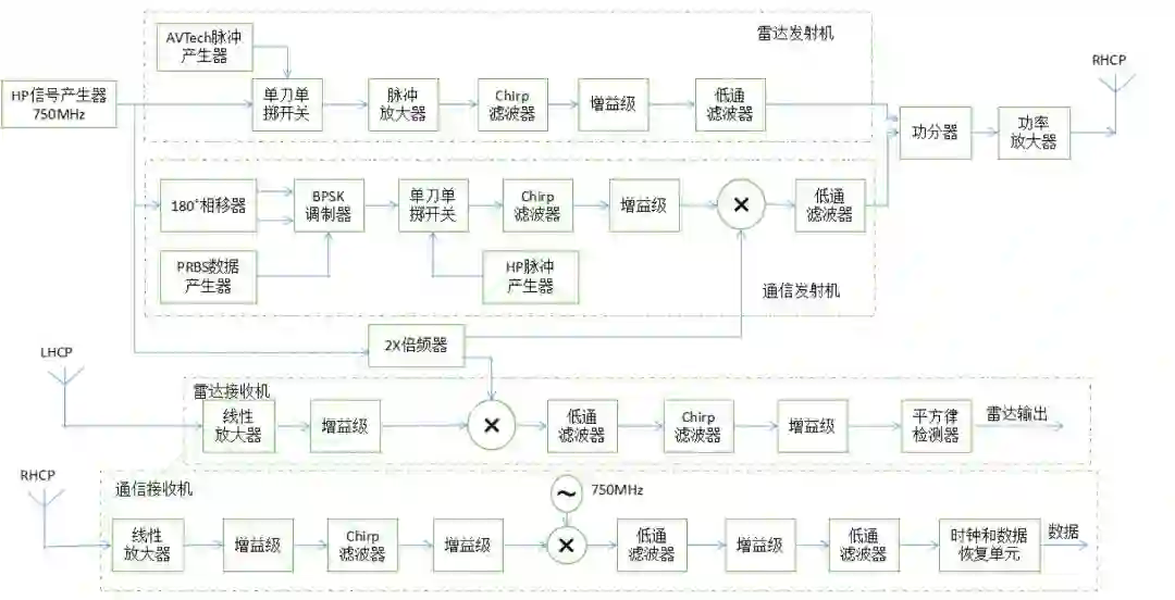 文献 [5] 中,作者使用了 Up-Chirp 信号(雷达)和 Down-Chirp 信号(通信)(它们基本正交),Chirp 信号的调频率为 1 GHz/μs,载波频率为 750 MHz,系统带宽为 500 MHz,脉冲时间为 0.5 μs(频率从最低到最高所需要的时间),处理增益(时宽带宽积)为 24 dB;数据调制方式是二进制相移键控(BPSK),射频频率为 75 MHz,发射功率为 27 dBm。