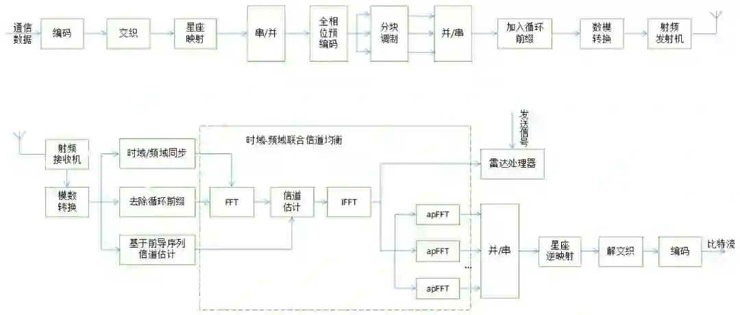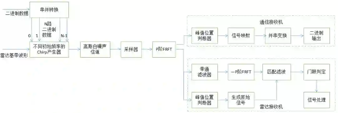 基于分数阶傅里叶变换(FRFT)方案的示意图如图 3 所示 [11]。雷达信号和通信信号是同一个,通信数据调制在不同的初始频率的 Chirp 信号上,接收端使用分数阶傅里叶变换分别把通信数据和雷达信号提取出来。