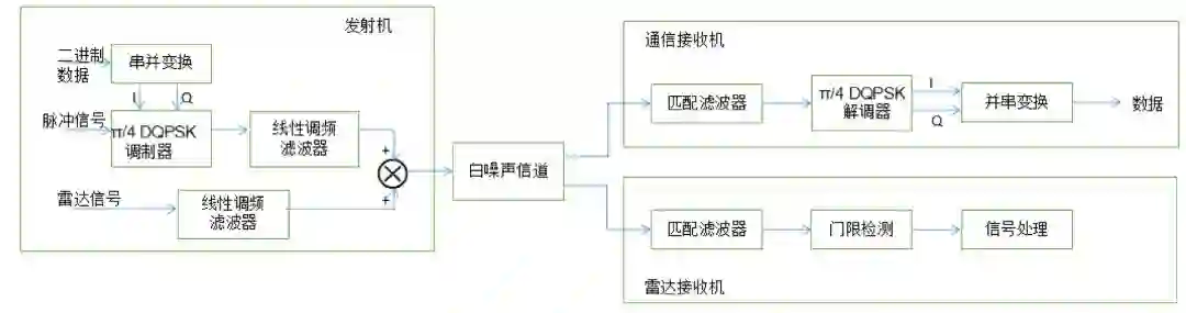 文献 [4] 中,作者使用了 Up-Chirp 信号(雷达)和 Down-Chirp 信号(通信)(它们基本正交),Chirp 信号的调频率为 40 MHz/μs,系统带宽为 80 MHz,脉冲时间为 2 μs(频率从最低到最高所需要的时间),处理增益(时宽带宽积)为 22 dB,数据调制方式是π/4-DQPSK;射频频率为 10 GHz。