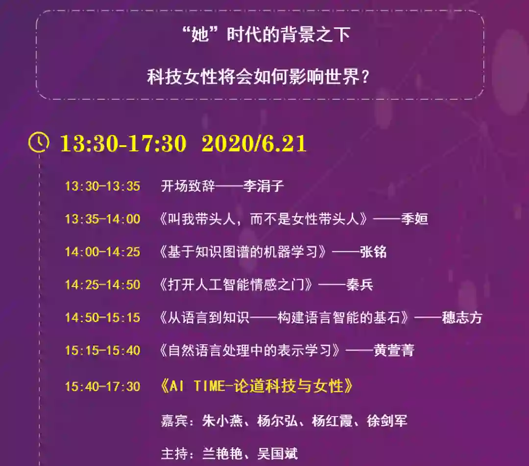 为更为全面、深入地探讨“科技与女性”这一话题,第十四期 AI Time 邀请了清华大学计算机系教授、AI 2000 上榜学者朱小燕,北京语言大学教授、智源学者杨尔弘,阿里巴巴达摩院资深算法专家杨红霞,中国计算机学会 YOCSEF 学术委员会学术委员徐剑军,由中科院计算所研究员、智源学者兰艳艳、滴滴出行科技生态与发展总监吴国斌主持,展开进一步的思辨与交流。