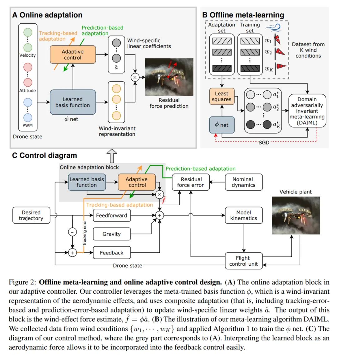 下图 2 为 Neural-Fly 方法概览,表明了它在自适应飞行控制和基于深度学习的机器人控制方面取得了进展。在标准 UAV 的动态风况下,Neural-Fly 实现了对灵活且具有挑战性轨迹的厘米级位置误差跟踪。具体来说,该方法主要有两部分组成,分别是