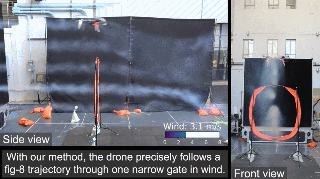文章开头我们已经初步见识到了无人机的抗风能力,下面展示了一架四旋翼无人机,借助该研究开发的工具,它可以在风速达到 27 英里 / 小时的情况下完成 8 字形穿梭操作: