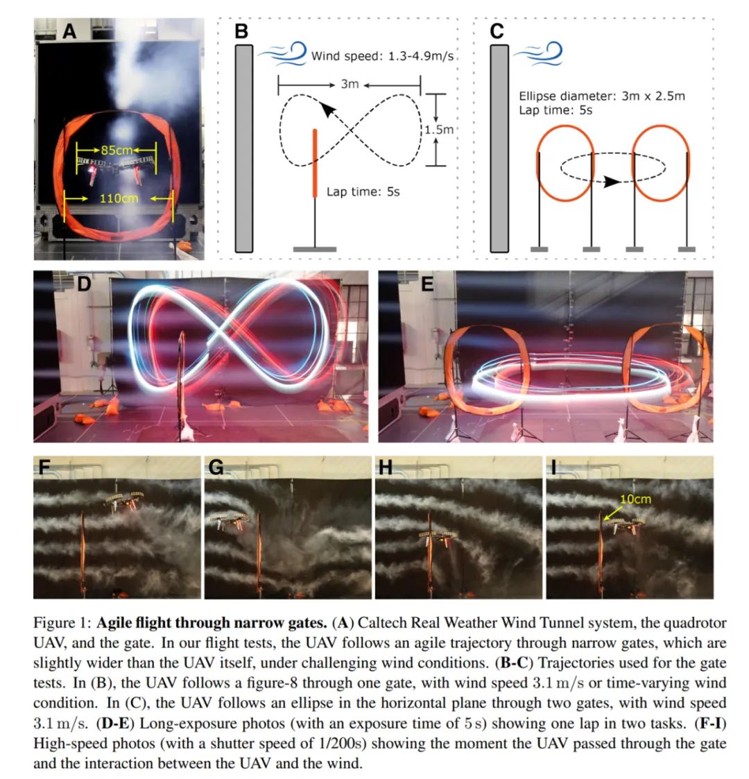 最后,研究者证明 Neural-Fly 能够实现一系列功能,允许无人机在狂风条件下遵循轨迹敏捷地飞过低高度门,具体如下图 1 所示。