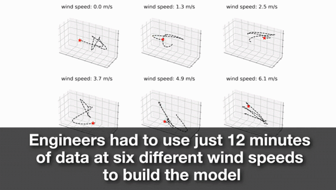 在 Neural-Fly 实验训练中,无人机在风洞中飞行,有六种不同的风速,最快的是 13.4 英里 / 小时。