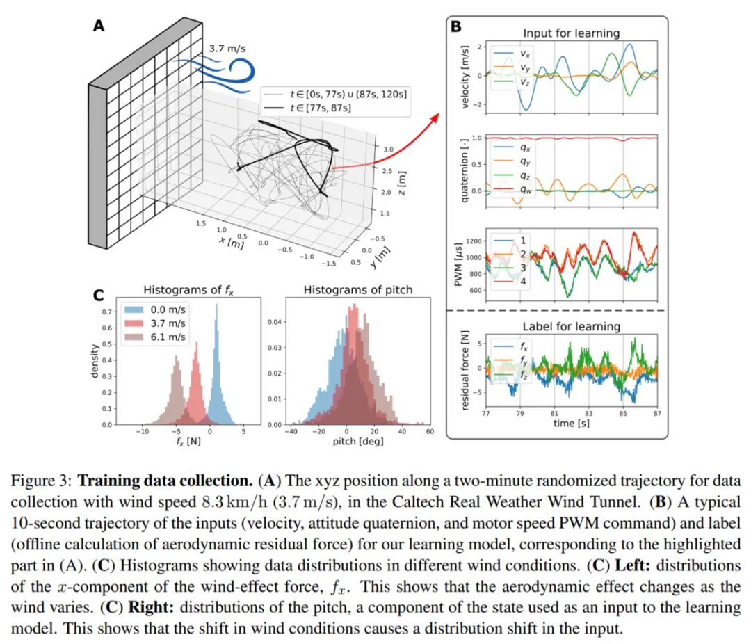 加州理工学院的研究者提出的「Neural-Fly」是一种数据驱动方法,它作为一种基于深度学习的轨迹跟踪控制器,可以学习快速适应快速变化的风况。下图 3(A) 为数据收集过程;3(B) 为风速 13.3km/h (3.7m/s) 的情况下,训练数据的输入和标签;3(C) 为不同风况下输入数据和标签数据的分布。