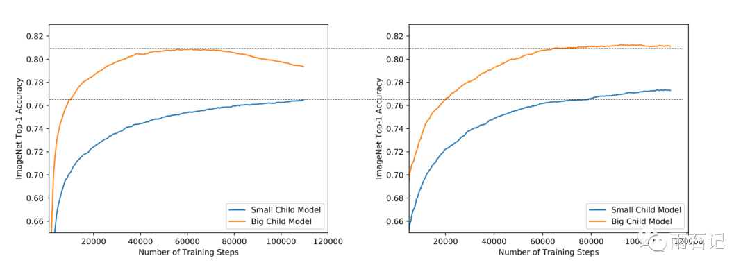 在实验中,发现大模型和小模型的收敛行为很不一致,大模型过拟合了小模型才刚刚收敛,如下图左。