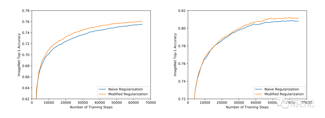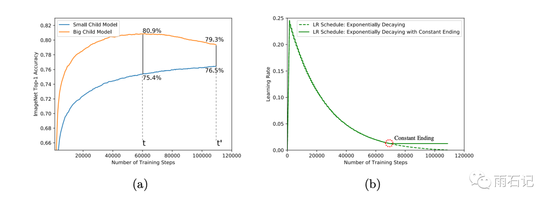 为了解决这个问题,对学习率进行了改进,将其变为指数衰减+常量结尾,即最后的学习率是一个常量,常量值是最初值的5%。如上图右。有了更大的学习率后,大模型会在最优解上左右摇摆,但不会过拟合,小模型会加快收敛。从而解决这个问题。