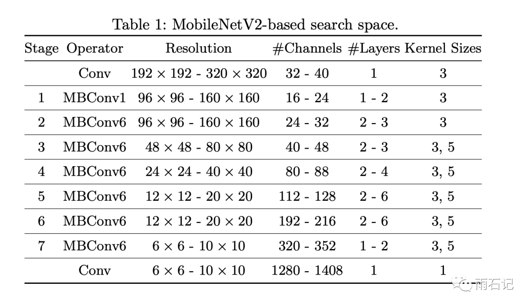 实验使用的搜索空间如下,这个空间基于MobileNetV2。