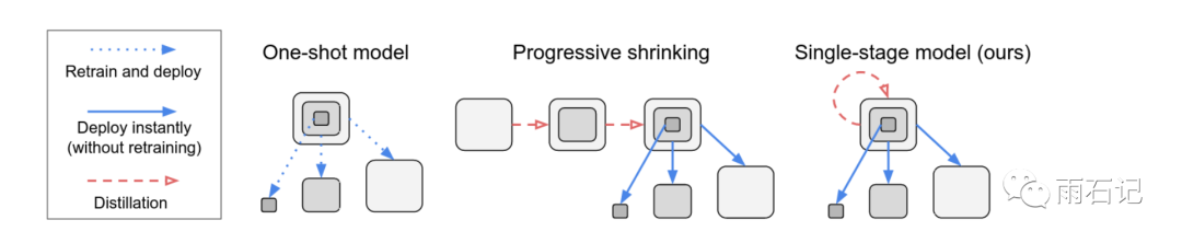 以下是三种从总模型到子模型的方法,其中,左图是得到总模型后,采样或者用某种策略得到子模型,然后再进行重新训练。中图则是得到总模型后,进行蒸馏,压缩得到各种各样的子模型。右图则是本文提出的方法,直接一步到位,训练得到总模型,然后总模型生成能够直接使用的子模型。