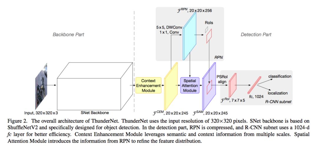 在计算机视觉领域中,如何在移动设备上实现实时目标检测是一个非常重要而又十分有挑战性的任务。然而,目前基于CNN的目标检测网络往往都需要巨大的计算开销,导致这些网络模型无法在移动设备上进行部署应用。在这篇文章中,我们探索了两阶段目标检测模型在移动端实时目标检测任务上的有效性,并提出了一种轻量级的两阶段目标检测模型ThunderNet。在骨干网部分,我们分析了之前的轻量级骨干网络的缺点,并提出了一种针对目标检测任务设计的轻量级骨干网络。在检测网部分,我们采用了极为简洁的RPN和检测头的设计。为了产生更有判别性的特征表示,我们设计了两个网络模块:上下文增强模块(CEM)和空间注意力模块(SAM)。最后,我们探讨了轻量级目标检测模型的输入分辨率、骨干网和检测头之间计算开销的平衡关系。与之前的轻量级一阶段目标检测模型相比,ThunderNet仅仅需要40%的计算开销就可以在Pascal VOC和COCO数据集上实现更好的检测精度。ThunderNet还在移动设备上实现了24.1fps的实时检测。据知,这是在ARM平台上报告的第一个实时检测模型。