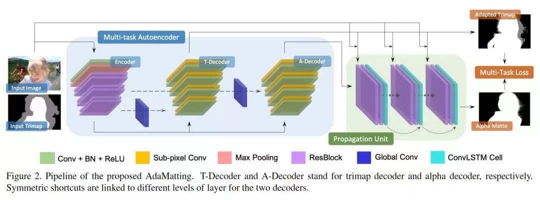 我们提出了图像去背 (Image Matting) 问题的一种全新框架。多数之前的图像去背算法根据输入三分图 (trimap) 在图像的指定区域中计算阿法值 (alpha)。对于被划入三分图待确认 (unknown) 区域中的完全背景和前景像素,这些方法期望精确地产生 0 和 1 的阿法值。本文指出,之前解法实际上将两个不同的问题混在了一起:1. 区分待确认区域中的前景、背景和混合像素; 2. 为混合像素精确地计算阿法值。其中我们称第一个任务被称为三分图调整 (Trimap Adaptation),第二个任务为阿法值估计 (Alpha Estimation)。其中三分图调整是典型的分类问题,阿法值估计是典型的回归问题,本文提出的端到端的 AdaMatting 框架,通过使用多任务学习 (Multi-task Learning) 的方式分开解决这两个问题,在多个图像数据集上的所有常用指标中取得了目前最佳的结果。