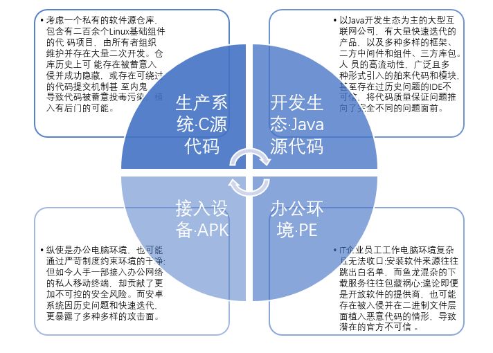 结合阿里巴巴为代表的典型互联网企业的软件供应链环境与实践,我们尝试将这混沌的庞大命题,划分为“软件供应链生产者”与“软件供应链消费者”的两仪乾坤,并抽象出“四象”战场:C源代码,Java源代码,PE二进制,APK二进制。