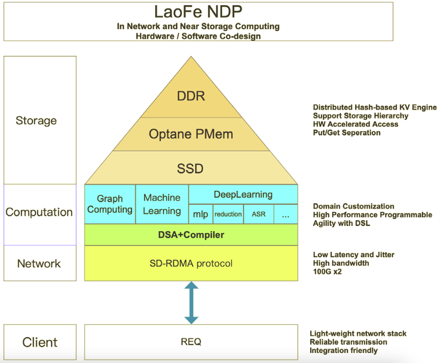 快手可提供异构加速选项的 LaoFe NDP 架构在计算层采用英特尔 CPU、FPGA、PMEM 等器件,实现了基于 LaoFeNDP 架构的 FPGA based KVS 实践落地,进一步提升快手在推荐、搜索、广告、风控等各种场景的应用性能。同时,其通过计算体系结构创新、软硬一体化、领域专用加速器设计,通过网络存、存储、计算三重加速来提供低延迟、高并发、高吞吐、低总体拥有成本(TCO)的基础资源。