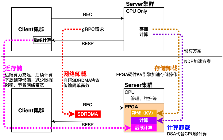 网络方面,LaoFe NDP 架构将 CPU 收发网络数据操作,卸载到 FPGA 上。Client 发送的请求包直接发送给 FPGA。相比 gRPC 基于 TCP/IP,功能过于复杂,性能和延时方案无法保证。而使用基于 FPGA 实现了一套 SD-RDMA 协议,通过应用层添加字段的方式,保证了类似 gRPC 的可靠性传输,这大大降低了请求时延。