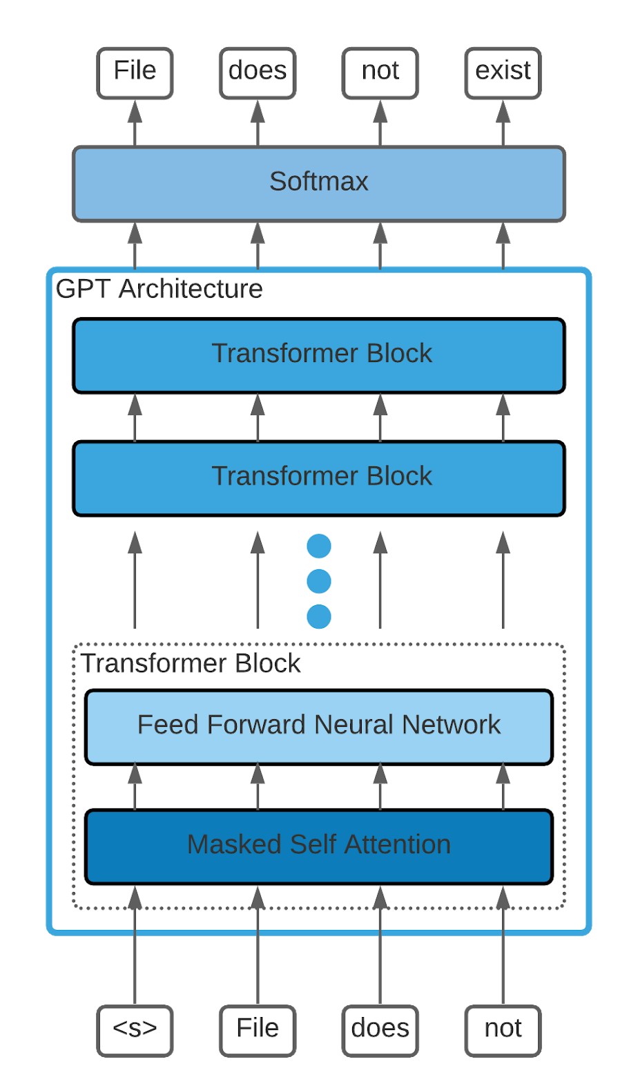 下图展示了我们所使用的架构。我们有 6 个解码器块,每个块都有一个自注意力层和一个前馈层。请注意,为简洁起见,该图省略了自注意力和前馈层上的跳跃连接,以及与这些跳跃连接相关的层规范化。