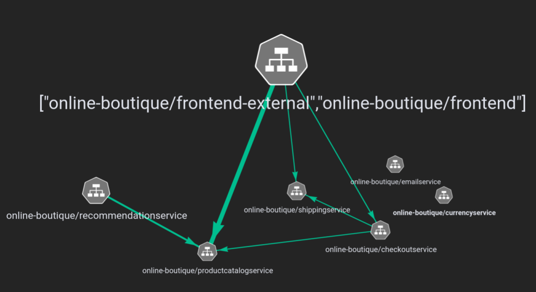 假设使用 Pixie 的开发者想要了解哪些类型的 HTTP 请求特别慢。他们无需手动筛查大量单独的 HTTP 请求,因为我们可以将 HTTP 请求进行语义聚类,然后显示每种语义聚类请求的延迟时间序列。为了对此进行说明,我们先讲解最终结果,然后再回过头来讲解如何得到这些结果。我们将利用 Pixie 对一款名为 Online Boutique 的演示版应用进行探索。将 Pixie 部署至运行 Online Boutique 的 Kubernetes 集群之后,就可以开始了。举个例子,我们可以看看 Online Boutique 应用中的网络连接示意图: