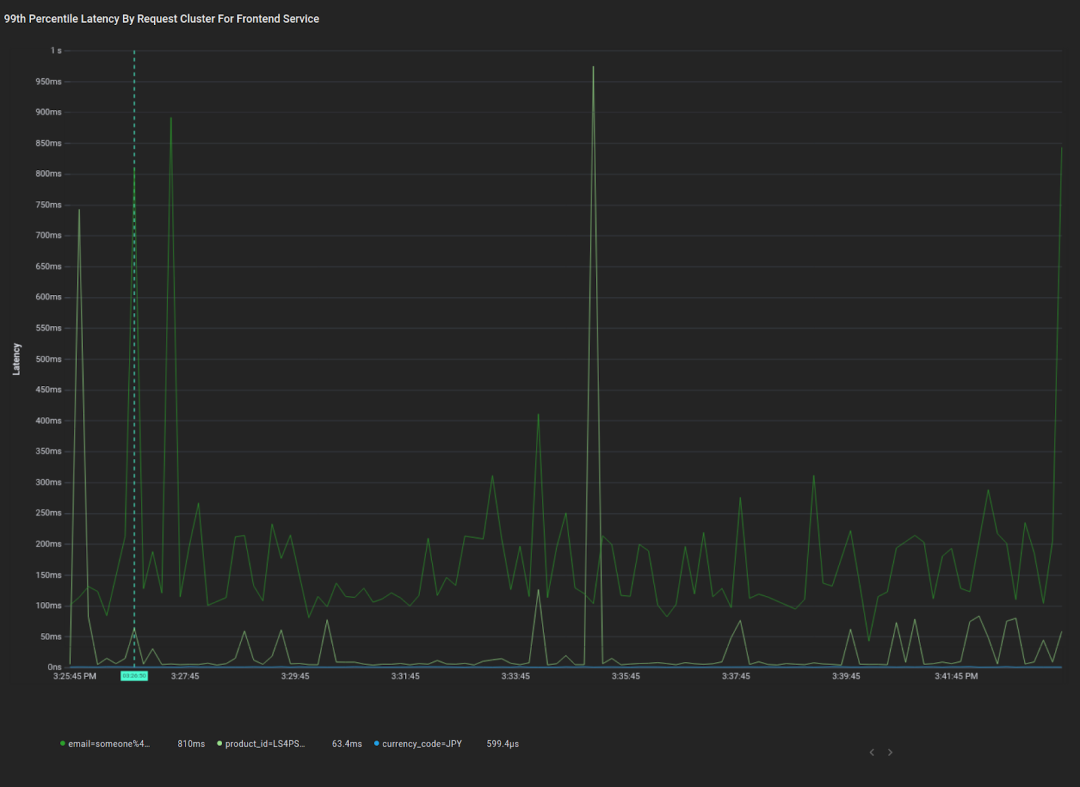 这是各个语义集群请求的第 99 百分位平均响应延迟时间图表。利用此图表,您可以快速确定发送至前端服务的三大类请求,以及这些请求的延迟概况。我们能够立即看到“电子邮件”请求集群的第 99 百分位平均延迟时间明显高于其他集群,而且“产品”集群偶尔会出现延迟尖峰。针对这两种可行的数据分析,我们可以进一步进行调试。现在,让我们来深入探讨如何达成这一目标。