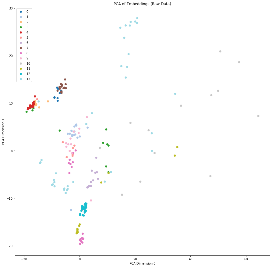 我们还可以查看模型特征空间的低维度表示,使用 PCA 将维数减少至二。下图显示了测试数据集中每个点的嵌入的前两个 PCA 维度。颜色代表点所属的语义集群。请注意,由于这些是嵌入空间的二维子空间中的分布图,点的绝对位置几乎没有意义,更多的意义来自每个集群的紧密度。在下图中,我们可以看到模型很好地分离了一些类,但在其他类上却失败了。