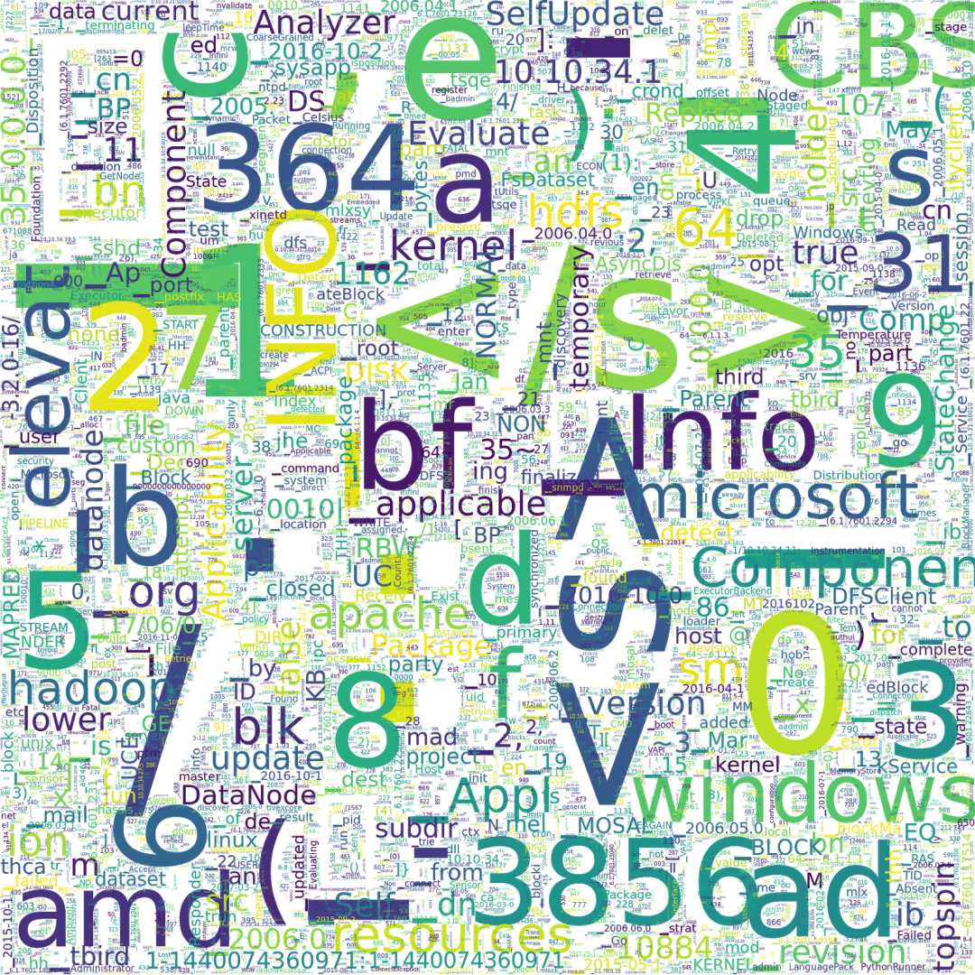 词云图,展示对 Logpai Loghub 计算机日志数据集进行词条化后的词汇子词片段