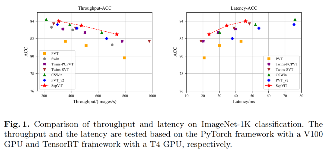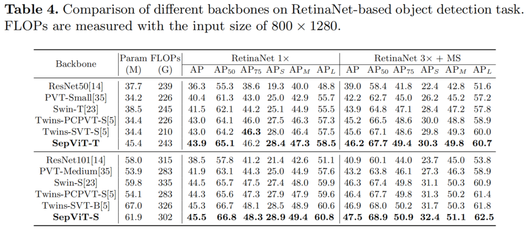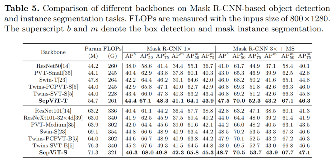 在各种基准测试任务上进行的大量实验表明,SepViT可以在准确性和延迟之间的权衡方面达到最先进的结果。其中,SepViT在ImageNet-1K分类上的准确率达到了84.0%,而延迟率降低了40%。在下游视觉任务中,SepViT在ADE20K语义分割任务达到50.4%的mIoU,基于RetinaNet的COCO目标检测任务达到47.5AP,基于Mask R-CNCN的48.7 box AP检测和分割任务实现43.9 mask AP。