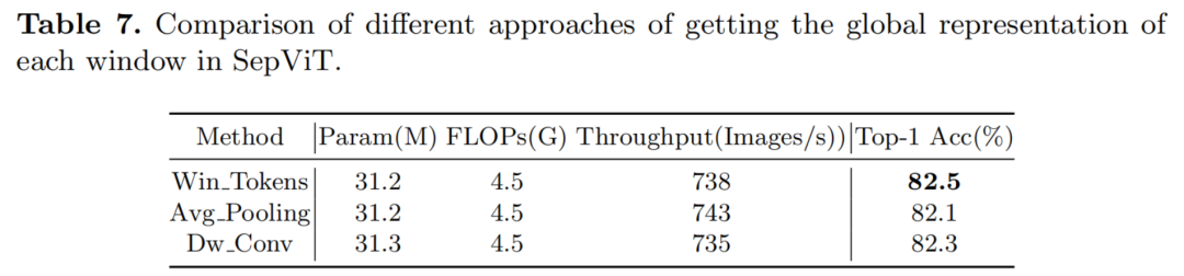 进一步研究了用固定的零向量或可学习向量初始化Window Token是否会有影响。与固定的零初始化方案相比,可学习的Window Token帮助SepViT-T将性能提高到82.5%,如表6的最后一行所示。