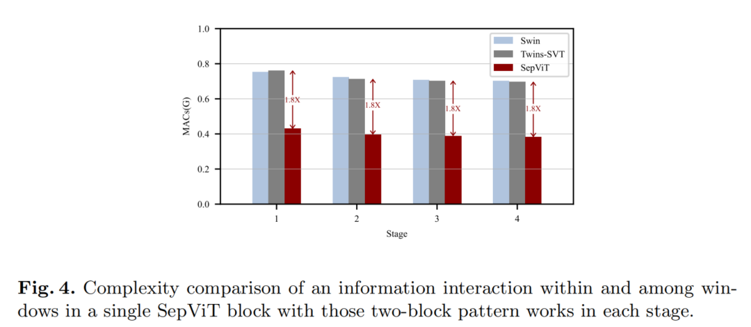 如图4所示,可以观察到,在网络的每个阶段,SepViT块只花费了其竞争对手的Mac的一半左右。原因在于2个方面: