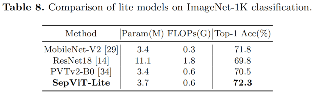 为了进一步探索SepViT的潜力,将SepViT缩小到一个精简版的模型尺寸(SepViT-Lite)。正如在表8中观察到的,SepViT-Lite获得了一个极好的最高精度,为72.3%,优于类似模型尺寸的同类算法。