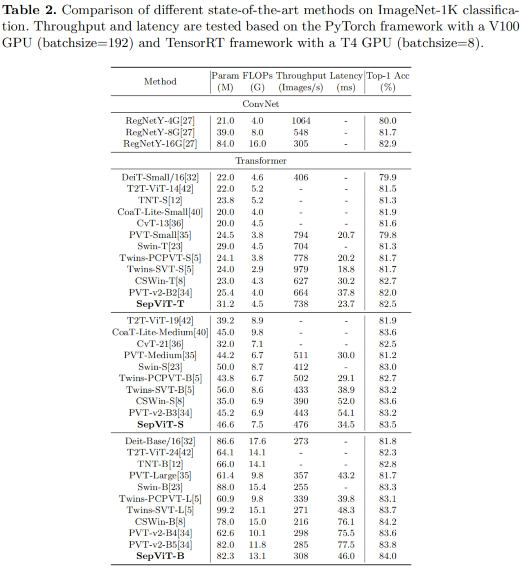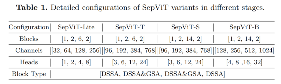 为了与其他vision Transformers进行公平的比较,作者提出了SepVit-t(Tiny)、SepVit-s(Small)和SepVit-b(Base)变种。