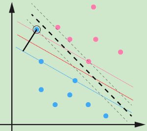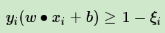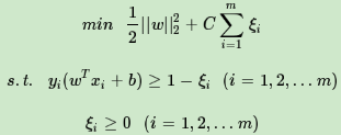 SVM对训练集里面的每个样本(xi,yi)引入了一个松弛变量ξi≥0,使函数间隔加上松弛变量大于等于1,也就是说: